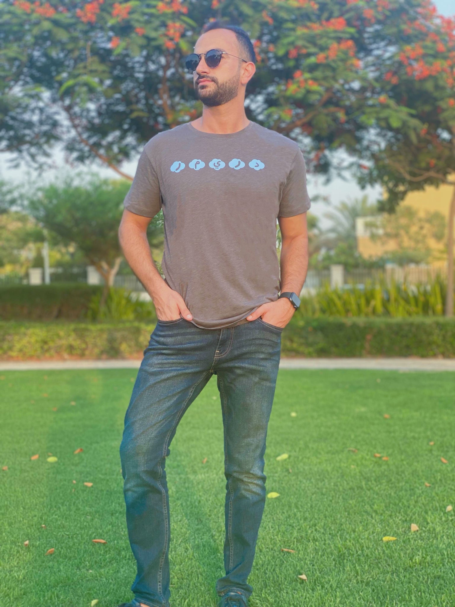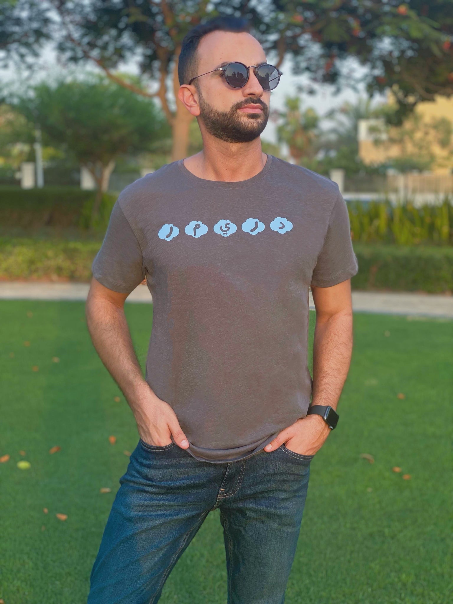 Dark grey organic cotton T-shirt designed with blue clouds and arabic letters engraved in them.